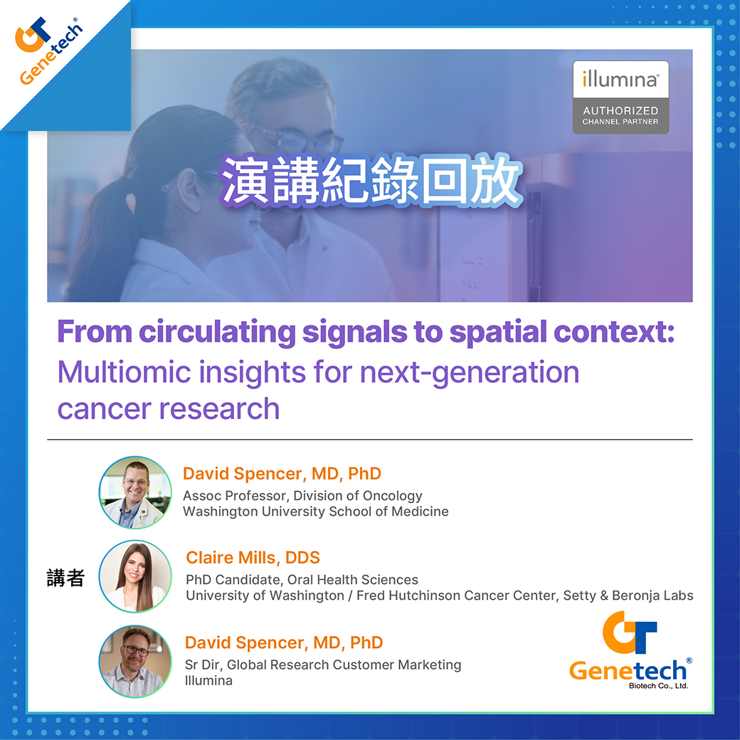 來自美國華盛頓大學的 David Spencer 醫學博士、牙醫醫學博士候選人 Claire Mills 與 Illumina 專家將分享:Illumina 在串聯多層次生物資訊方面的最新創新,以及分析液態活檢的 5-base 甲基化資訊以及空間解析基因表現圖譜的應用案例。